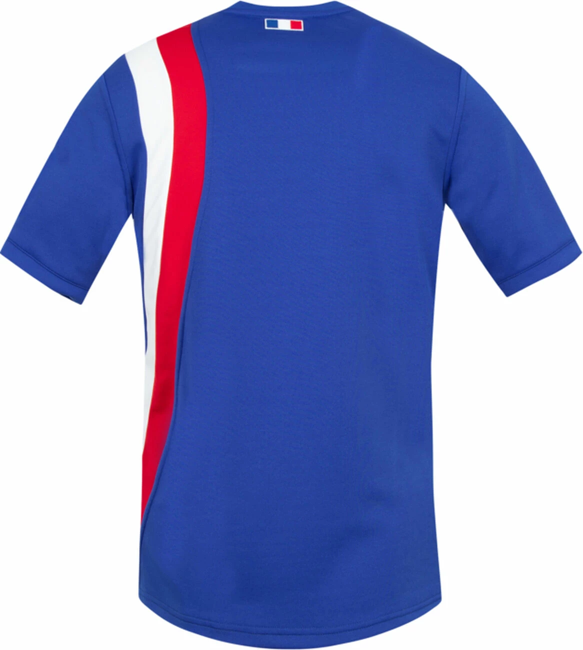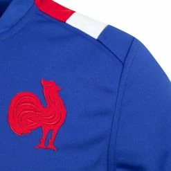 Déclinaison Junior. Ecusson de la Fédération Française de Rugby et logo. Performance brodés de part et d’autre de la poitrine. Drapeau français brodé au niveau de la nuque. Bandes contrastés sur la manche gauche. Col original. Inscription “Notre maillot, notre histoir, notre pays” dans l’encolure. Empiècements texturés sur la partie supérieure du maillot. Inscription “FRANCE RUGBY” ton sur ton sur la manche gauche.
