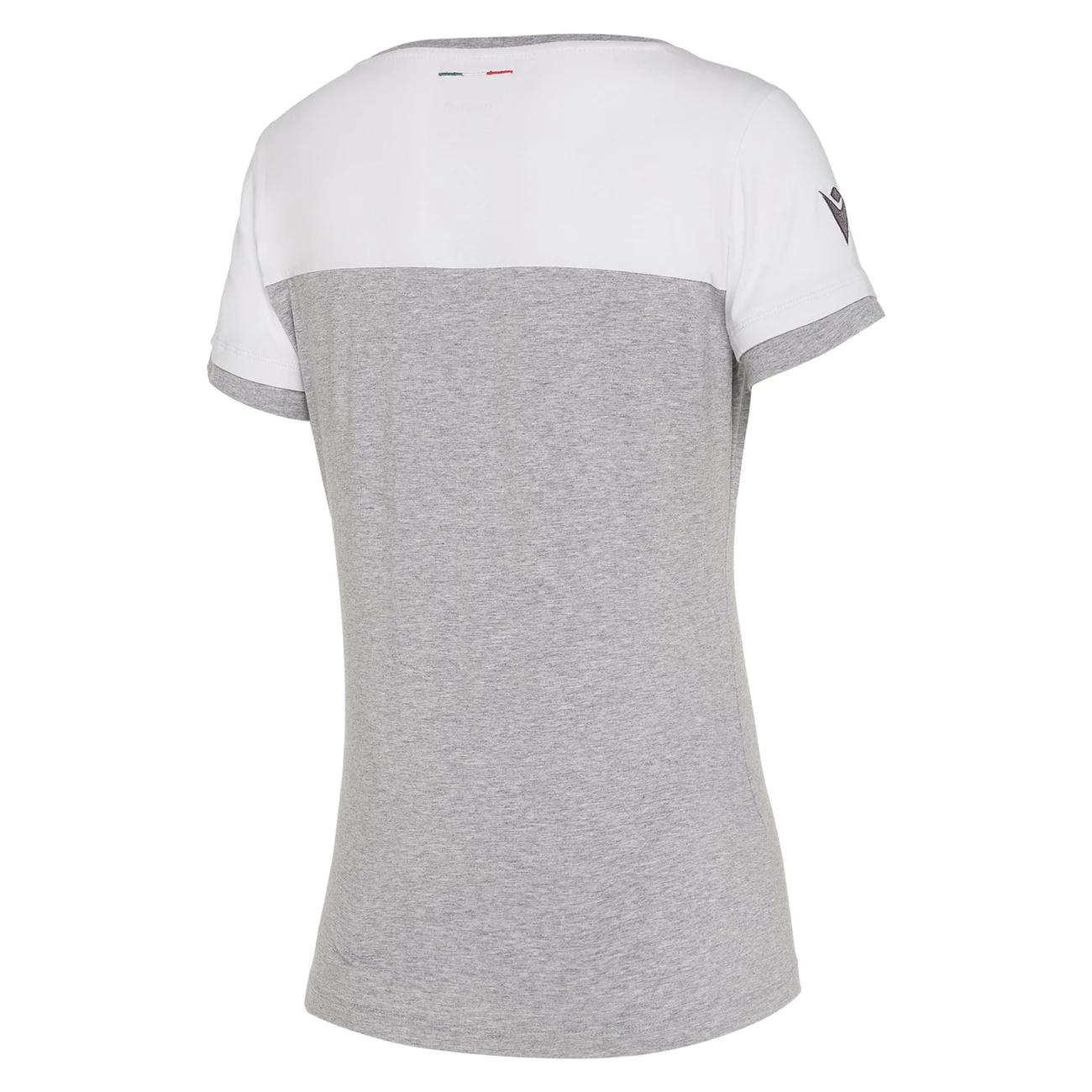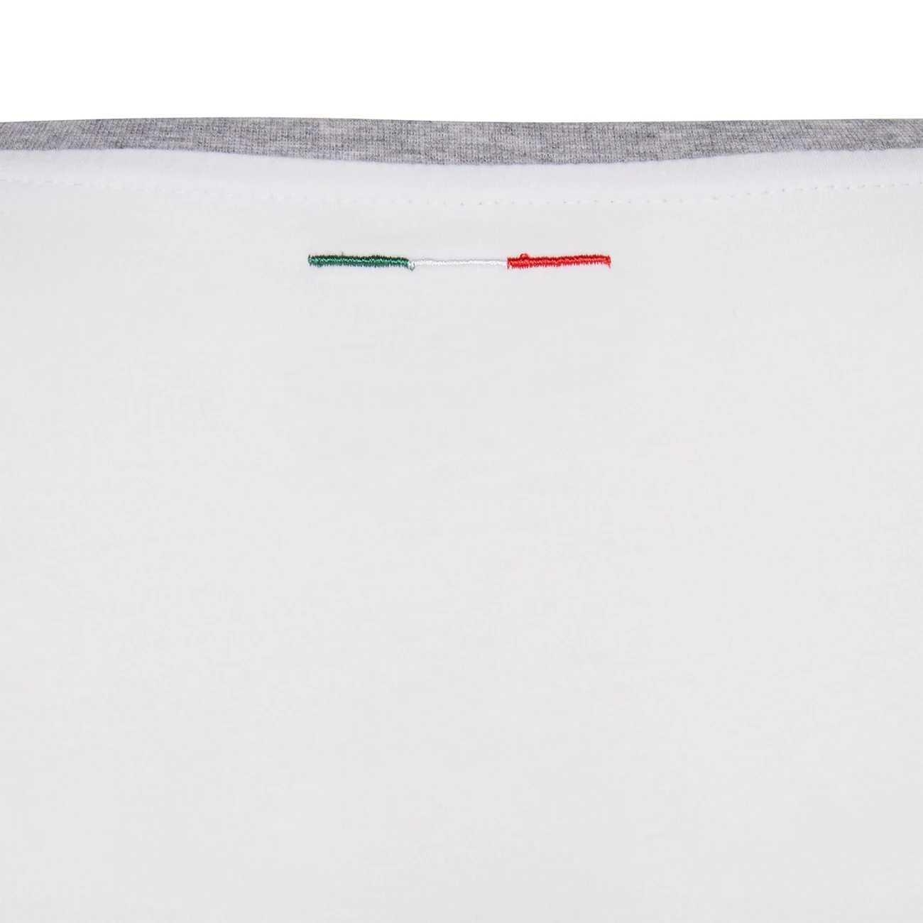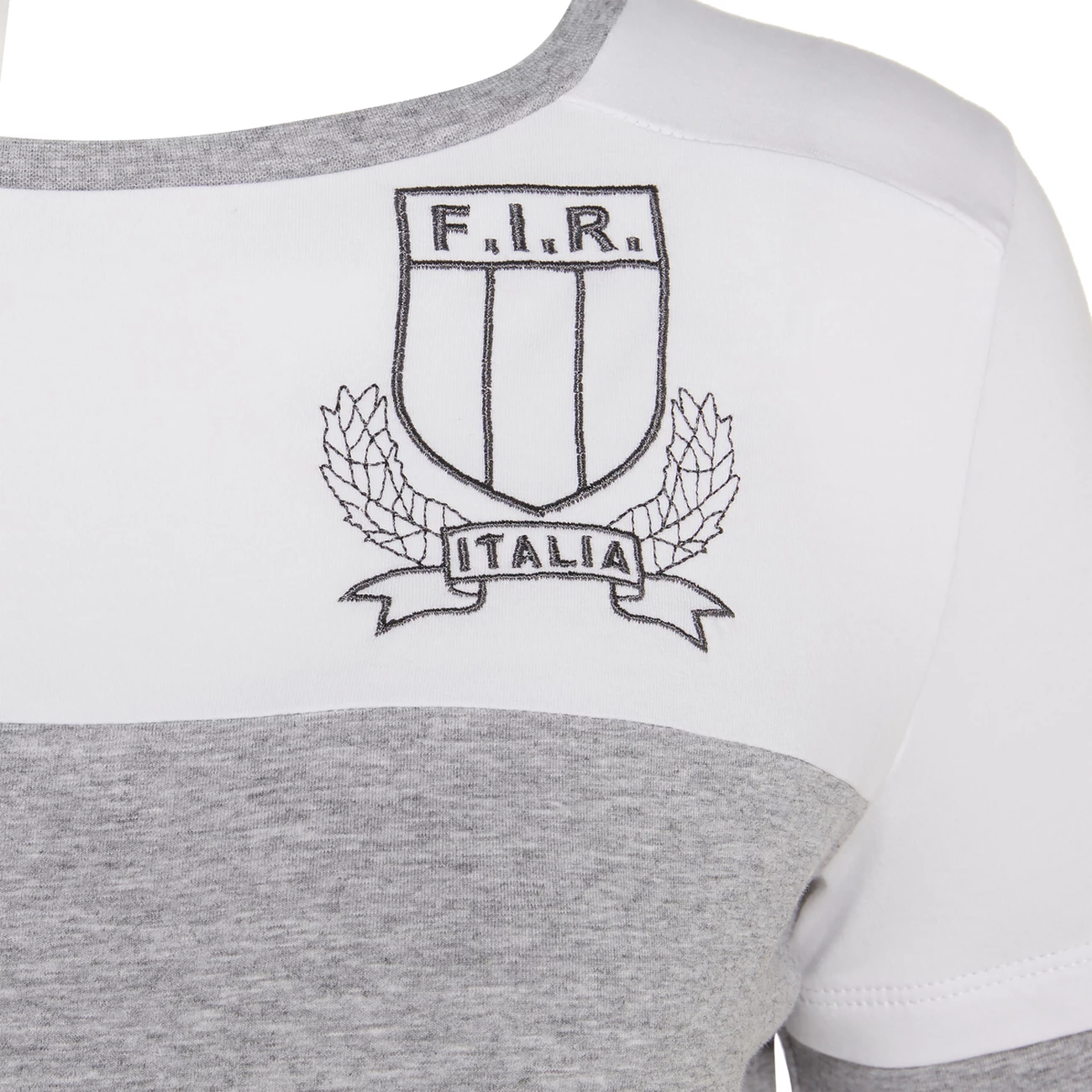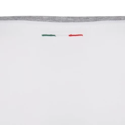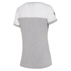 Le t-shirt pour femme de la ligne supporter de la Fédération Italienne de Rugby allie le blanc au gris à effet mélange. Réalisé dans un jersey de coton doux, il présente au dos du col l’élégant drapeau italien tricolore brodé et sur la poitrine, côté cœur, la broderie monochrome du patch de la fédération.